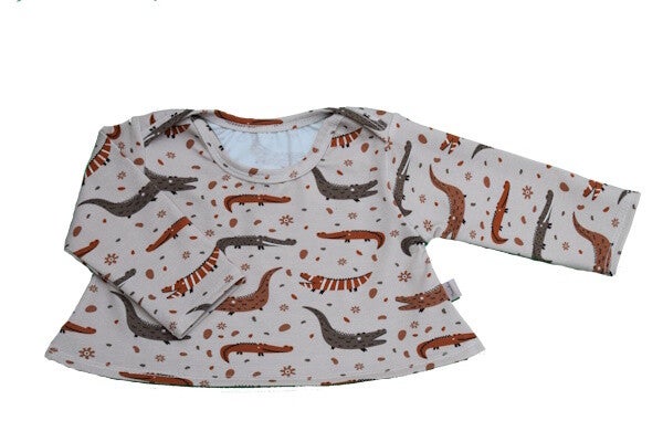Het Shirtje Croco in Sand is ideaal voor baby’s met een Pavlik-bandage, gipsbroek of campspreider.