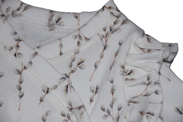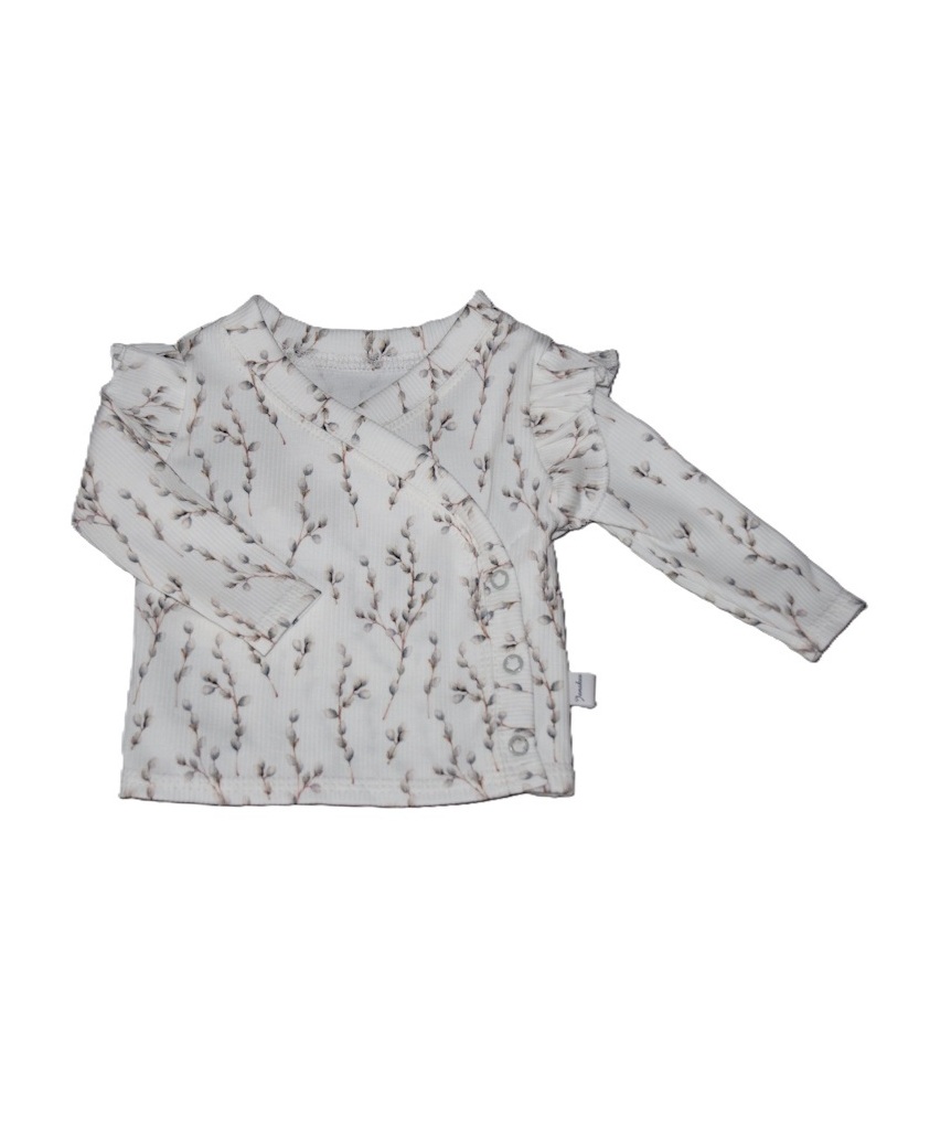 Dit schattige overslagshirtje Marjolein in maat 44 is speciaal ontworpen voor premature meisjes. De zachte ecru ribstof met subtiele veldbloemen geeft het een lief en modern tintje, terwijl de fijne ruches op de schoudertjes een elegante uitstraling toevoegen. Perfect voor ouders die stijl en comfort willen combineren in de prematuur kleding van hun kleintje.
